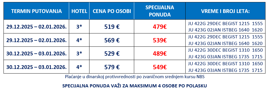 Hotel Delta 3* – Lokacija:Nalazi u centralnoj četvrti Laleli-Aksaray, na svega 1 km od Kapali čaršije i na oko 20 minuta hoda od istorijske četvrti Sultanahmet. Novi aerodrom je udaljen oko 34 km, a aerodrom Sebiha Gokcen na oko 33 km.Sadržaj: U sklopu hotela Delta 3* se nalazi restoran i bar. Wi-Fi internet na recepciji.Sobe su dvokrevetne (dva odvojena ležaja ili bračni ležaj) ili dvokrevetne sa pomoćnim ležajem (dva odvojena ležaja ili bračni ležaj i pomoćni ležaj). Sve sobe imaju kupatilo (tuš), mini bar (uz doplatu, na licu mesta), TV, telefon, klima.Usluga:Noćenje sa doručkom. Doručak – švedski sto.